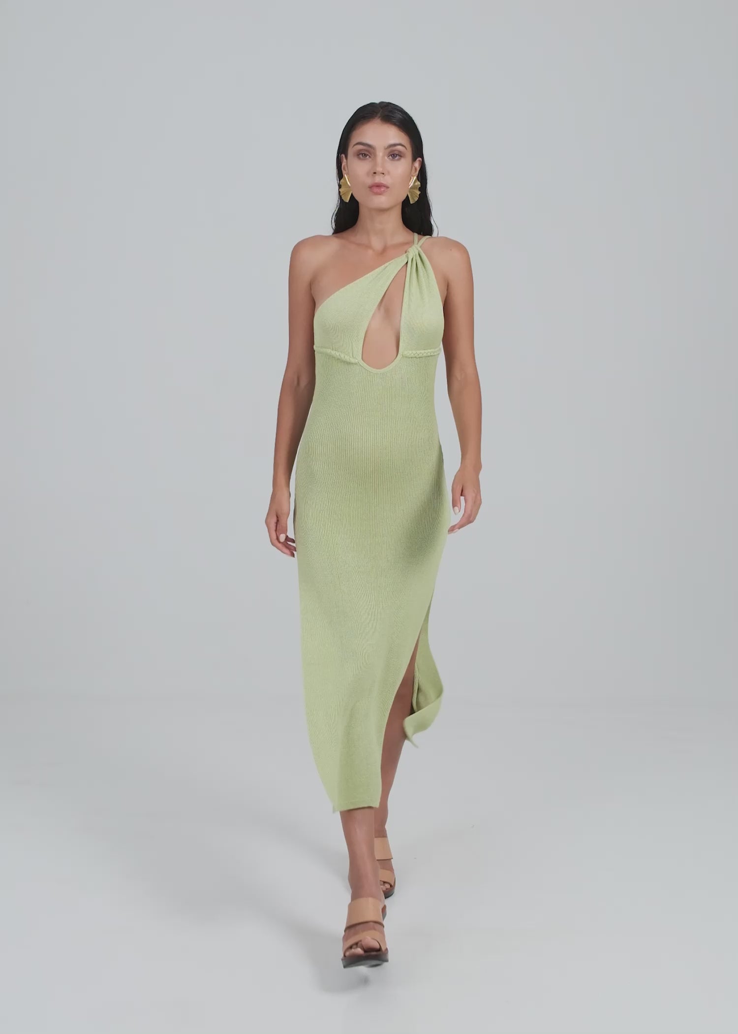 The Iona knit dress takes you straight to the sun-drenched shores of Greece. Crafted from a supremely soft rayon yarn, the dress is medium weight with an asymmetric flattering neckline & braid detail under the bust. In a fresh green hue, this maxi dress channels the pops of natures hues, inviting you to lounge beneath the Mediterranean sun with effortless style.