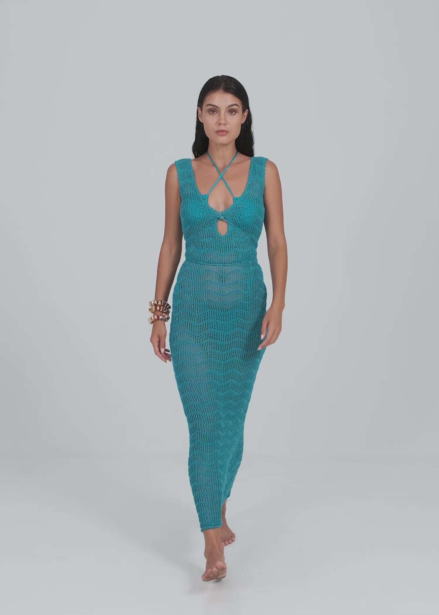 This limited-edition vibrant teal knit maxi dress is your vacay vibe made wearable. The wave motif print channels beach cover-up energy, while the maxi silhouette skims your curves. The perfect versatile addition to your summer wardrobe, in that coveted limited colurway you'll want to wear on repeat. Just add sandals and you're set for chilled-out island living.