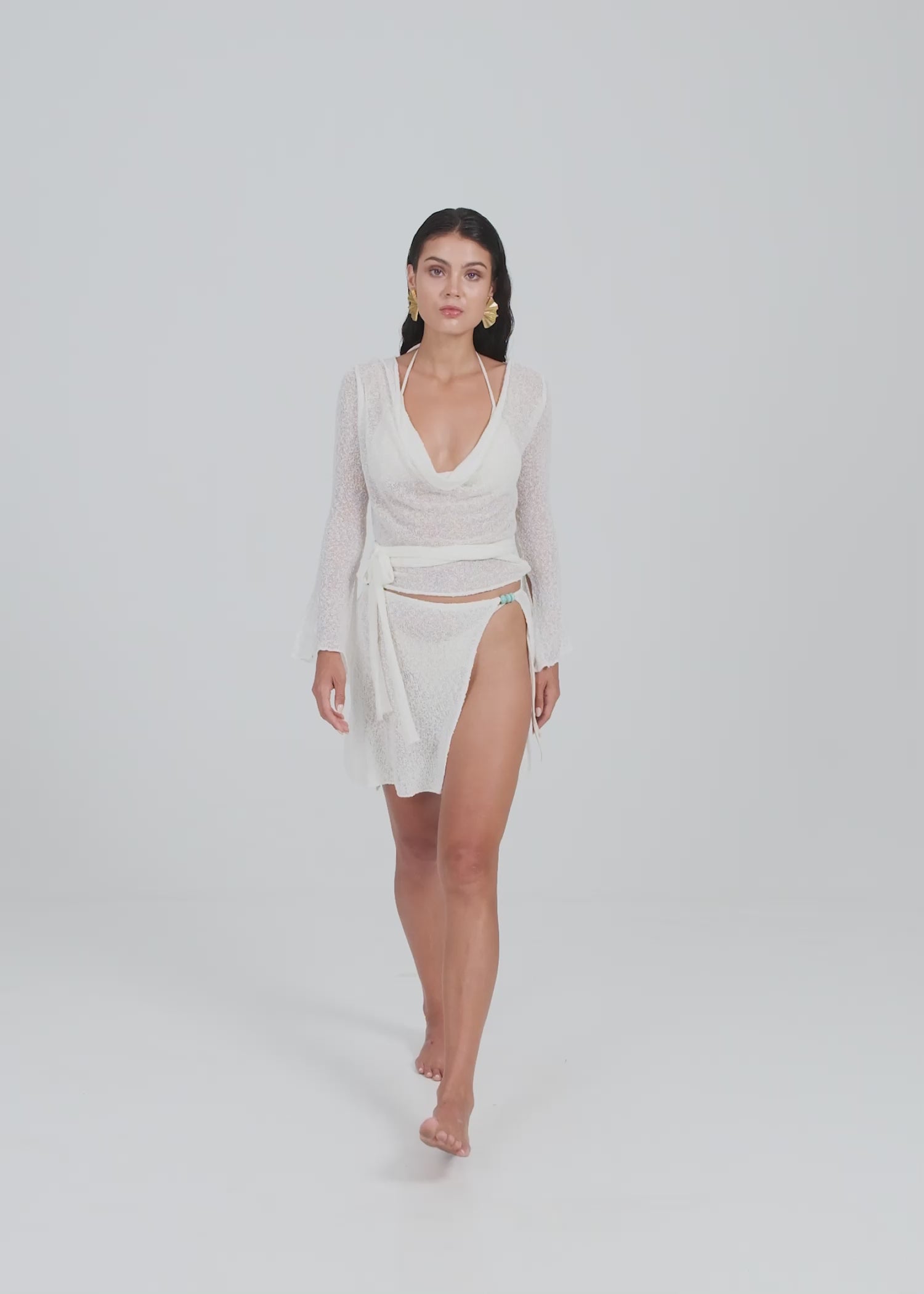 Elevate your beach style with our Sayulita Top. This sheer knit cover up in white features long sleeves and a wrap-around detail, perfect for a day to night look.Stay effortlessly chic when paired with the Sayulita mini skirt.